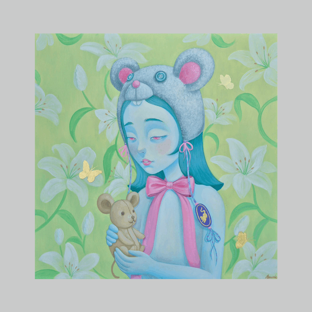‘Rat’ by artist Saengrawee Klangmanee captures the contrasting emotions of innocence and loneliness within a fantastical, fairy-tale color palette. The artwork features a girl with blue skin wearing a mouse-eared hat, set against a light green background filled with a lily pattern, creating a languid and dreamy atmosphere. With a faintly melancholic expression, the girl holds a small mouse doll tightly to her chest. The pink ribbon and the flush on her cheeks contrast with her cool blue skin, emphasizing her fragile and delicate inner world. The image of the girl and the mouse doll symbolizes their most intimate bond, metaphorically representing a lonely soul seeking comfort and protection from the world. The title ‘Rat’ might refer to the wariness or wisdom the animal symbolizes, or simply the most cherished friend of the girl.