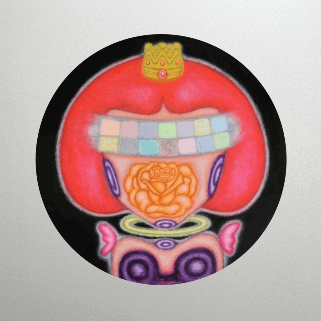 Similar to ‘Rose 03,’ half of the face is covered by a skull-like mask, but this time featuring yellow hair adorned with a pink rose. This piece visually expresses human vulnerability, shadow, or loneliness hidden behind the beautiful rose and vibrant colors. Elements like the blue wings and rainbow-colored neck adornment suggest that this figure exists on the border between reality and fantasy.