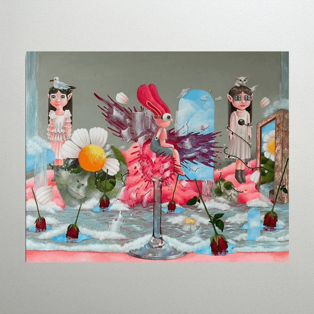 This piece captures a moment of ‘stillness,’ with a girl encased in a large block of ice, surrounded by smaller ice cubes embedded with blue and white flowers. Wearing a fancy bunny-eared headdress and a dress, the girl is frozen as if suspended in time. The surrounding ice blocks symbolize the cooling of emotions or an inhibited state that resists change in a bid to preserve purity. The red-haired character outside seems to be offering a gesture of salvation with a bouquet of flowers.