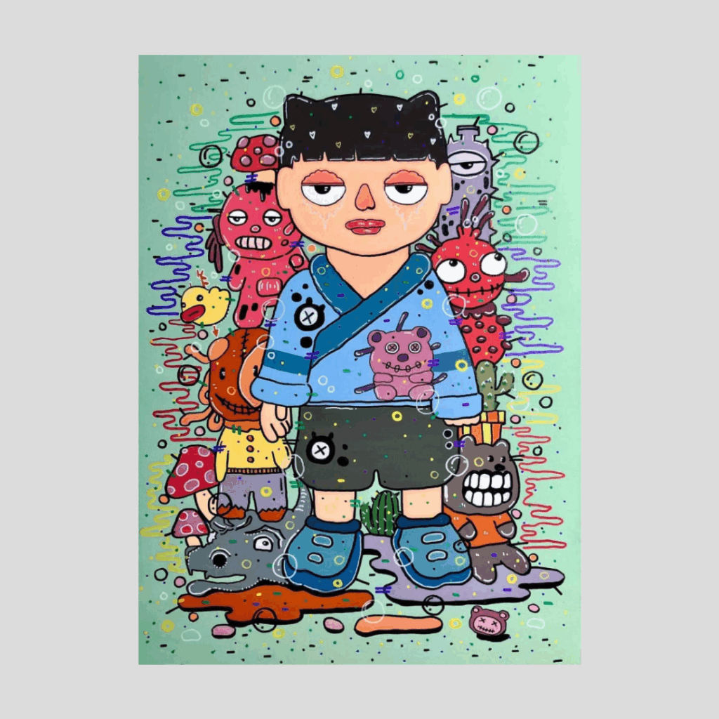 By Noey Infinyty, acrylic on canvas. A blue‑wrapped child stands among stitched toys, mushrooms, and cacti. Dots and bubbles draw a tender armor—imagination guarding a shy heart.
