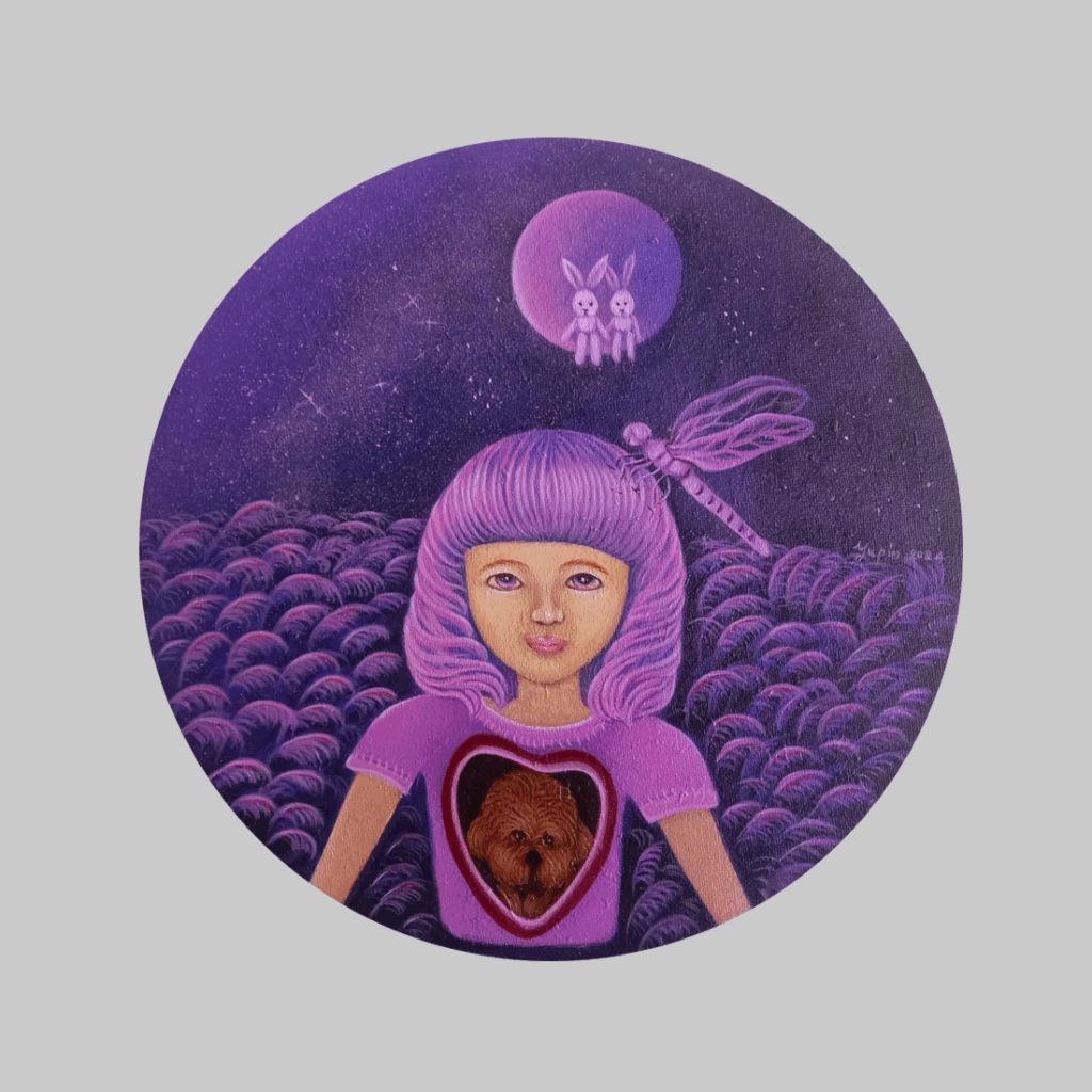 A girl with violet hair holds her pet dog nestled close to her chest. Her heart shines like starlight, and the two rabbits reflected in the moon symbolize eternal companionship. This work shows that a pet is not a mere presence, but a piece of our very heart.