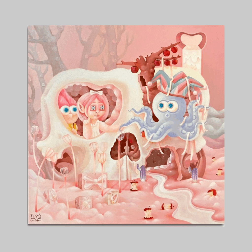 This work tackles the heavy themes of death and romantic loss using fairy-tale imagery within a pastel-pink, surreal landscape. The giant skull at the center symbolizes memories of the past or the remnants of a vanished love. Inside the skull’s eye sockets, two small doll-like figures stand affectionately, metaphorizing the memory or bond that persists eternally despite loss. A bizarre entity, such as an octopus with rabbit ears, stands beside the skull, visually representing the confusion and strange emotional states that follow love. The work explores the traces of destruction and renewal left by love in a romantic yet haunting manner.