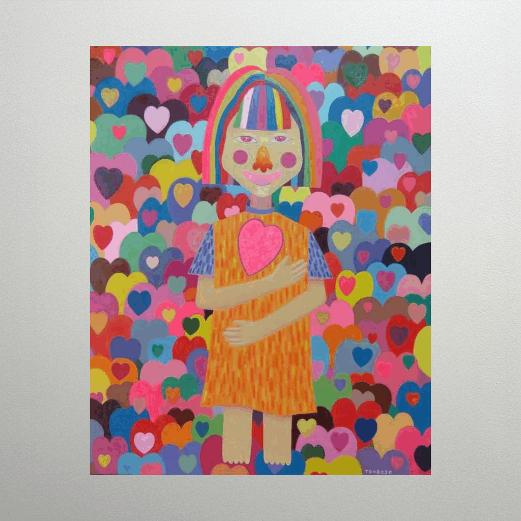 As the title suggests, this piece captures a girl’s view of the entire world as a place filled with ‘love.’ The girl, with rainbow-colored hair, stands against a background composed of countless large and small hearts, embracing a pink heart to her chest. The hearts, in their intense and contrasting colors, symbolize the varied forms of love in the world, showing the girl’s pure resolve to hold firmly onto her own heart and embrace the world’s diverse affection.