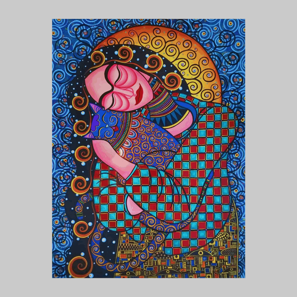 ‘True Happiness # 1’ by artist Chayanisa Sriwichainan uses intense and dynamic colors and patterns to express inner joy and a sense of security.  Against a vibrant, swirling blue background, a woman sits peacefully, eyes closed, wearing a blissful smile. She tightly embraces a decorative blue cat. The red and teal checkered pattern covering her body seems to symbolize the complex and unsteady external world. Behind her head, a golden and orange crescent moon shape rises, emphasizing the tranquility and mystical solace she feels.  This work vividly and powerfully illustrates the fundamental human need to find True Happiness and emotional stability through the deep, unconditional bond with a pet, even amidst the complex and dazzling patterns of the world.
