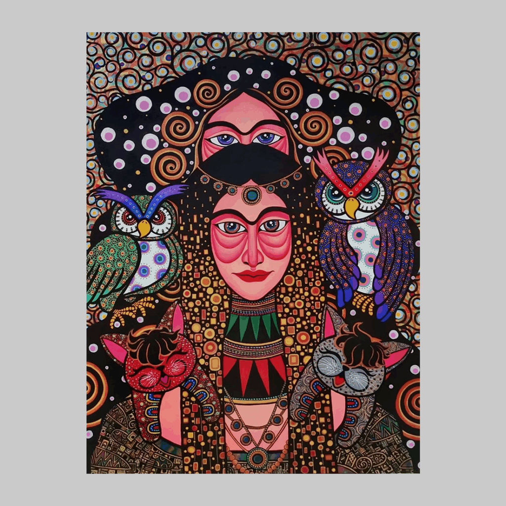‘True Happiness #9’ by artist Chayanisa Sriwichainan is a captivating portrait that uses intense, decorative patterns to explore multiple selves, wisdom, and inner stability. At the center of the work is the figure of a woman who appears to have two faces. The primary face, with red cheeks and a deep gaze, looks forward, while another face, showing only the eyes, sits above it, symbolizing an inner observer or a transcendent self. The woman’s body and the background are filled with golden spirals, pointillism, and vibrant motifs, evoking the decorative art of Klimt. Flanking the woman and below are owls and cats. The owls symbolize wisdom and insight, and the cats represent mystery and spiritual companionship. All these elements intensely visualize the true happiness and inner abundance gained through acknowledging the multiple self and attaining wisdom and insight even within a glamorous and complex world.