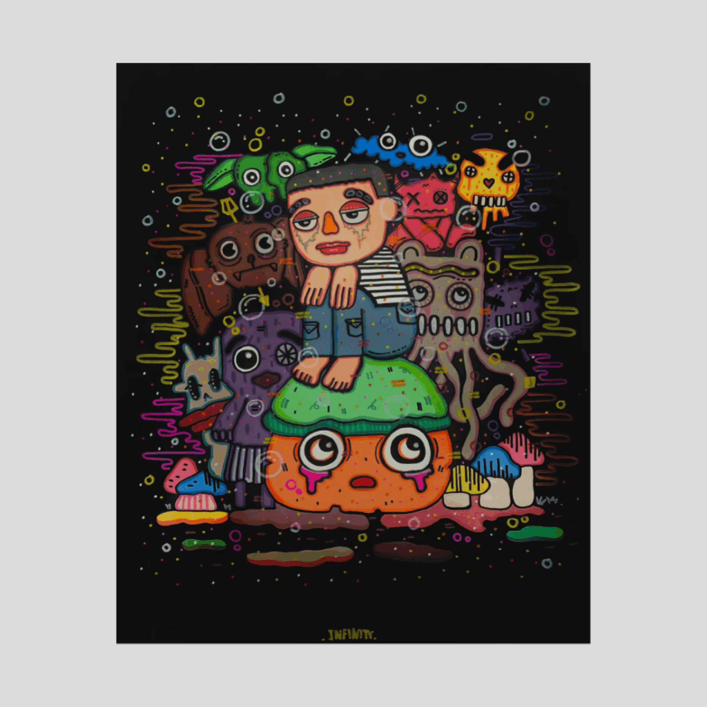 By Noey Infinyty, acrylic on canvas. A figure hugs knees atop a teary orange creature in starry black. Neon beasties hover like worries and jokes, turning gloom to carnival.